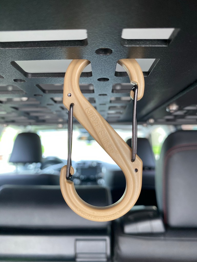 We kid about our “Mall crawlers,” but most vehicles are used as daily drivers, only going off-road for 10% of their operational time (or less). Most of us will find ourselves getting groceries more often than on a trail, and while it’s cool to make our vehicles more capable off-road, it’s also important to make our vehicles more capable of their daily duties. This is one small modification that improves our vehicles for daily use as well as Overlanding. The S-Biners can be used for hanging other small bags and items from the Rago Fabrications shelf. They are quick and easy to use, and they are very strong.